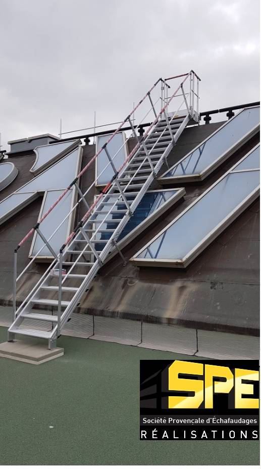 La Société Aptis à Gémenos en région PACA, dans le département des Bouches-du-Rhône, se rapproche de la société SPE à Vitrolles pour la réalisation d'un escalier menant aux désenfumages de la toiture du Centre Commercial Grand Littoral à Marseille.