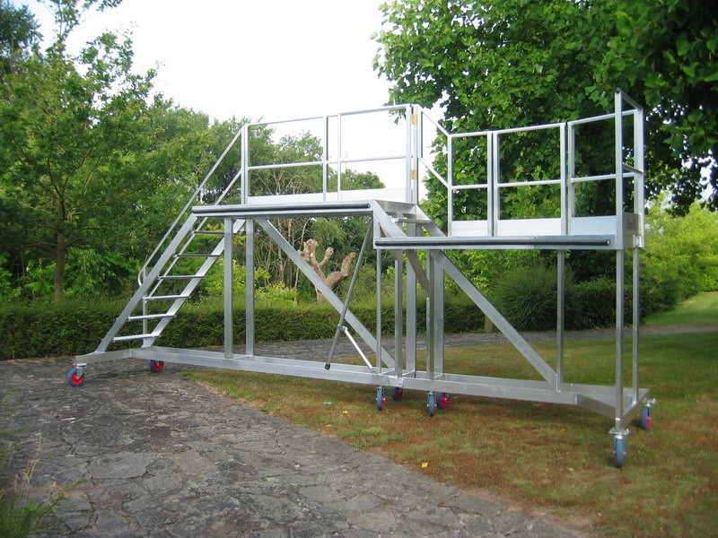 Le praticable livré est constitué d’un système d'assemblage modulaire en aluminium, équipé de garde-corps robustes et d'un plancher en caillebotis ou en tôle larmée, selon les besoins spécifiques. L'ensemble est conçu pour être léger, mobile et durable.