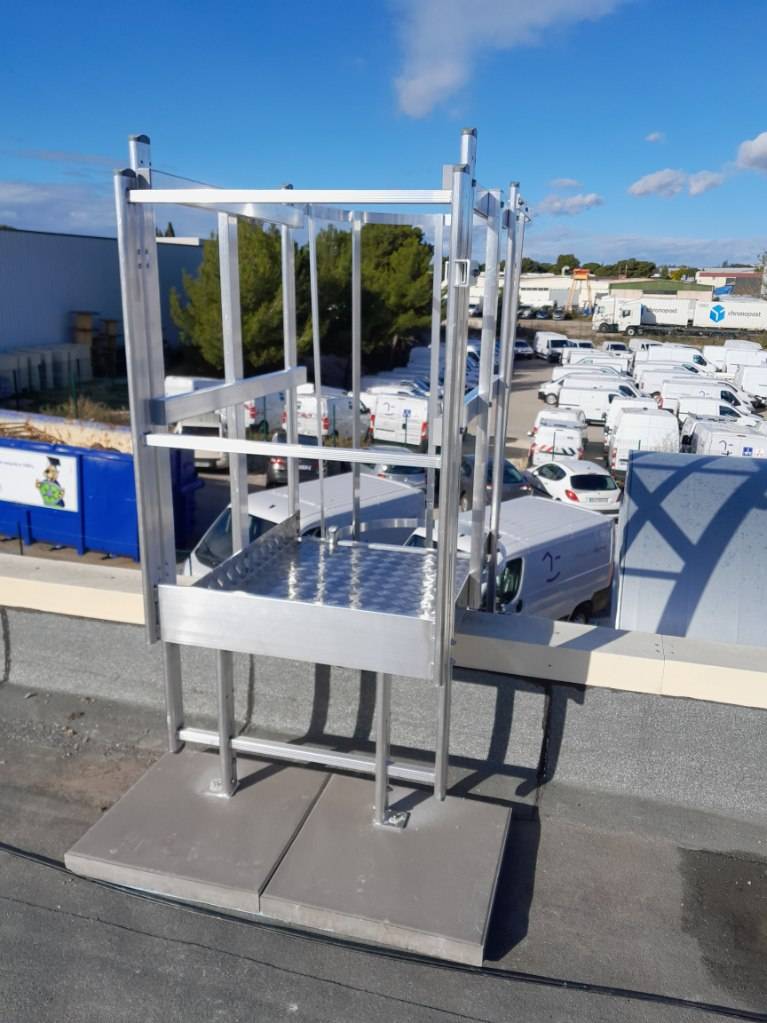 Une entreprise spécialisée dans le secteur des supérettes, bien établie dans la région, a sollicité nos services pour l'installation d'une échelle à crinoline sur son bâtiment à Vitrolles, dans les Bouches-du-Rhône. L'équipe de cette entreprise avait besoin d'un moyen sécurisé pour accéder à la toiture du bâtiment, caractérisé par un support de bardage métallique et un acrotère de 600 mm de largeur. Après une évaluation attentive, nous avons recommandé une échelle à crinoline dotée d'une structure en aluminium, parfaitement adaptée à ce type d'infrastructure.