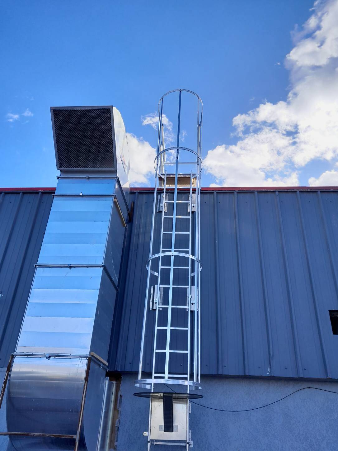 Pour renforcer la sécurité, l'échelle est équipée d'un arceau de protection, offrant une barrière de sécurité en cas de chute ou de conditions météorologiques défavorables. La priorité à la sécurité demeure au cœur de nos préoccupations chez SPE. Enfin, en vue de faciliter l'accès au toit, un portillon frontal a été installé à l'extrémité de l'échelle.