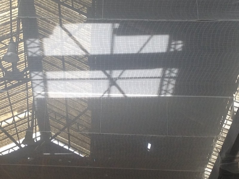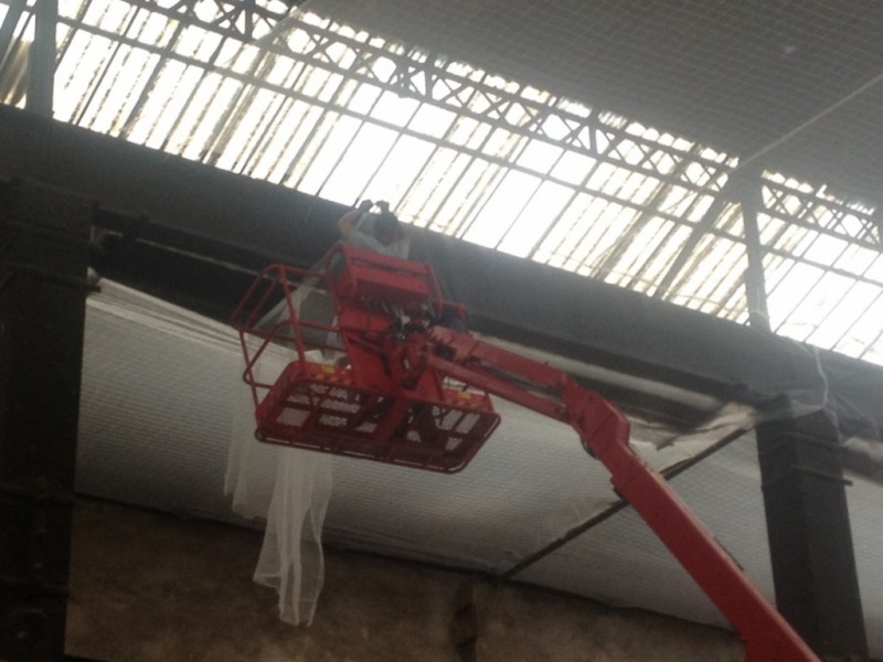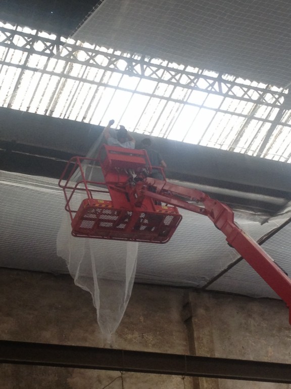Dans l’exemple présenté ici, la toiture de l’ouvrage est en cours de dépose. Afin d’assurer la sécurité des équipes de chantier, nous avons procédé à la pose de filets anti-chute en sous-face. Il est important de souligner que ces filets de sécurité ne remplacent pas l’utilisation des équipements de protection individuelle (EPI), mais viennent en complément pour renforcer la sécurité globale du site.